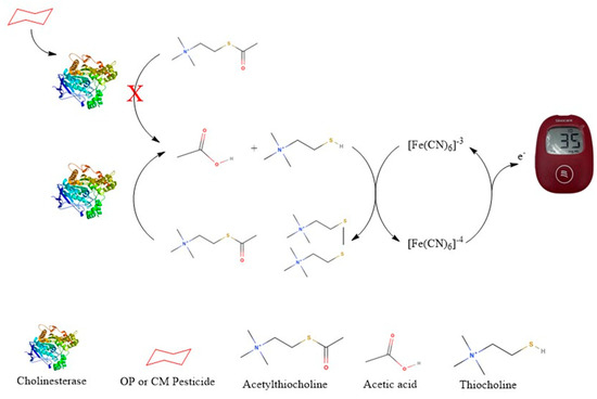 Personal blood glucose meters (PGMs) are a cost-effective and accessible biosensing platform for diabetes management [24]. Their widespread availability allows for potential applications such as environmental and biomedical sensors. Initially designed for glucose detection, PGMs had limited applicability in rapid analysis contexts. However, Lu et al. [25] advanced their functionality by integrating glucose detection with target assessment via functionalized DNA-coupled glucose invertase. This innovation enabled the quantification of non-sugar components based on glucose levels, thus overcoming previous limitations. Consequently, PGMs have evolved to detect various molecules beyond sugars. Recent research has investigated electrochemical processes initiated by thiocholine for identifying pesticide residues and assessing cholinesterase inhibition [24,26,27].