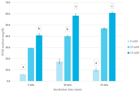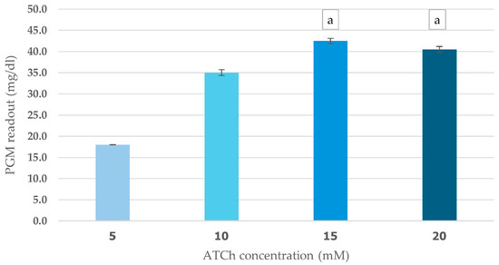 Effect of ATCh concentration and incubation time on ChE activity (mg/dL) in whole blood sample. PGM readout was measured at different ATCh concentrations (5, 10, and 15 mM) at 25 °C over 15 min. Means followed by the same letter are not significantly different (p > 0.05; one-way ANOVA; post hoc Bonferroni Multiple Comparisons).