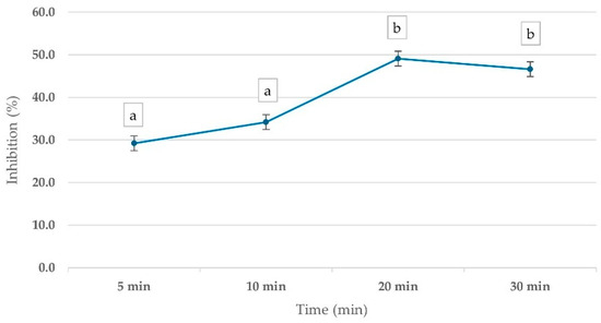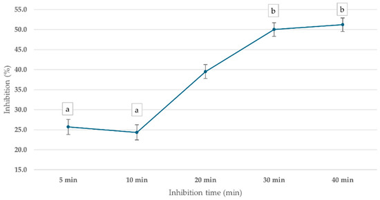 ChE inhibition was observed across all time points, with the percentage inhibition increasing over time, as shown in Figure 6. After 5 min of incubation, ChE activity was inhibited by 25.7%. At 10 min, the inhibition slightly decreased to 24.3%, suggesting a temporary fluctuation in enzyme response. However, by 20 min, inhibition returned to 39.5%, and the highest inhibition (50.0%) was observed at 30 min, indicating a time-dependent increase in mevinphos-induced ChE inhibition. The 30 min incubation time was used in further steps.