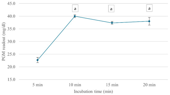 Then, the test was conducted to determine the optimal incubation time for cricket ChE activity measurement. ChE activity was assessed using 15 mM ATCh at incubation times of 5, 10, 15, and 20 min at 25 °C. The incubation time that resulted in the highest enzyme activity was selected as the optimal condition for the PGM readout method.