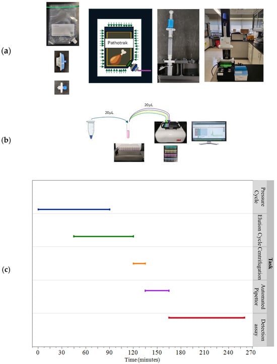 Figure 1. Pathotrak workflow and integration with Neogen MDS. (a) The figure illustrates the workflow of the NGE system, starting with the introduction of a poultry sample into a Pathotrak bag equipped with a capture membrane. The bag is subjected to isostatic pressure within a Pathotrak pod, facilitating the separation of target pathogens from the bulk sample. Bacteria captured by the membrane are subsequently eluted, and the eluate is concentrated to a target volume of 20 µL using centrifugation and an automated pipettor. (b) The concentrated sample is added directly to the lysis buffer of the Neogen MDA, which is then transferred to reagent tubes specific to pathogen detection. (c) The accompanying graph depicts the time allocation for each processing step and the multiplexed detection process for 96 samples.