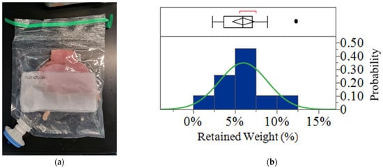 Figure 2a shows a sample of the chicken within a Pathotrak bag post-cycle. The distribution of the retained weight percentages across all samples is depicted in Figure 2b. The median percentage of retained weight was found to be 6%, with an interquartile range (IQR) between 4% and 7%. The minimum observed retention was 2%, while the maximum reached 12%, suggesting a consistent but slight residual presence across samples. The mean retained weight was calculated as 6% (Std Dev = 3%). The distribution fitted a normal curve, supported by a Shapiro–Wilk test (W = 0.907 and p = 0.0553) and an Anderson–Darling test (A2 = 0.579 and simulated p value = 0.1168).