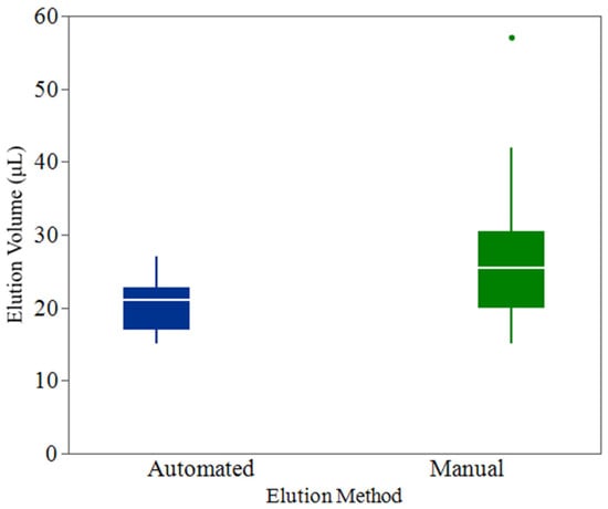 Figure 3. Box plot comparison of elution volumes between automated and manual methods. The boxes represent the interquartile range (IQR), with the horizontal line indicating the median elution volume. Whiskers extend to the minimum and maximum observed values within 1.5 times the IQR, with any data points beyond marked as outliers. The automated method demonstrated significantly lower and more consistent elution volumes compared to the manual method (p < 0.0001), with tighter 95% confidence intervals around the mean. Points beyond the whiskers of the box plots represent outliers.