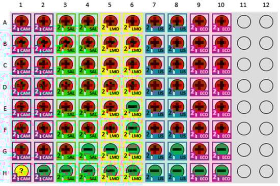Figure 4. MDS Plate Layout for Standard Curve Development. MDS plate layout and prevalence output used for generating the standard curve for time to detection. Each row represents a specific dilution level of a pathogen, with rows A–G depicting 108 to 102 CFU/mL and row H serving as negative controls. The plate includes duplicates for each dilution to ensure accuracy and reliability of the detection results. The color-coded representation indicates the type of pathogen tested (CAM = Campylobacter spp., SAL = Salmonella, LMO = Listeria monocytogenes, LIS = Listeria spp., and ECO = Escherichia coli O157). Positive results are reported in red (+), and negative in green (–). Indeterminate results are reported in yellow (?).