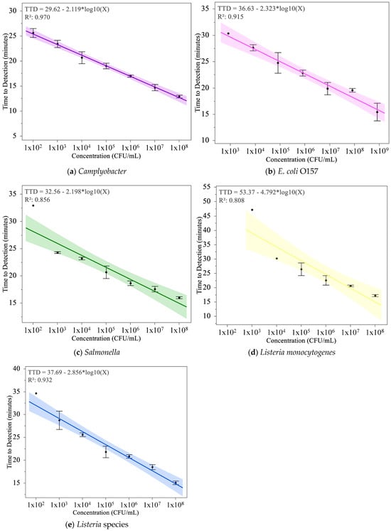 Intercept values, which represent the theoretical TTD at a log10 concentration of 0, ranged from 29.62 for Campylobacter to 53.37 for L. monocytogenes. Higher intercepts, such as those for L. monocytogenes (53.37) and Listeria spp. (37.69), reflect longer TTDs overall, particularly at lower concentrations, where reduced sensitivity was observed. Lower intercepts, such as those for Campylobacter (29.62) and Salmonella (32.56), correspond to shorter TTDs, supporting their applicability for detecting pathogens at lower bacterial loads. These trends were statistically significant for all pathogens, as indicated by p values for the regression models (p < 0.0001 or p = 0.0004).
