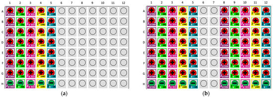 The experimental plate layout is depicted in Figure 4 and details the arrangement used for the assays. Each row (A–G) represented a 10-fold dilution series, ranging from 108 to 102 CFU/mL, with duplicate wells per concentration to enhance result reliability. Row H contained negative control wells to confirm assay specificity. Pathogens tested included Campylobacter spp., Salmonella, L. monocytogenes, Listeria spp., and E. coli O157. The MDS output confirmed consistent detection at higher concentrations, while at lower concentrations some wells showed false negatives, highlighting assay limitations in sensitivity at the lower limit of detection.