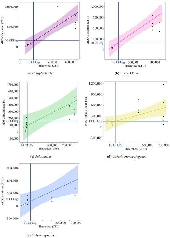 Figure 7. Theoretical vs. Measured Pathogen Concentrations Using MDS Kits post processing with the Pathotrak NGE. Theoretical concentrations (CFU/g) are plotted on the x axis against MDS-measured concentrations (CFU/g) on the y axis for bacterial pathogen assays: Campylobacter, E. coli O157, Salmonella, Listeria monocytogenes, and Listeria species. The dark blue horizontal and vertical lines indicate the critical detection threshold of 10 CFU/g. Each data point represents the relationship between the theoretical and measured concentrations for an individual sample. The colored regression lines, matching the colors used in the MDS kits for each pathogen, illustrate the fit through the data points. Shaded regions around the regression lines represent the 95% confidence intervals, highlighting variability in the detection measurements. Panels are color-coded as follows: purple for Campylobacter (a), pink for E. coli O157 (b), green for Salmonella (c), yellow for Listeria monocytogenes (d), and blue for Listeria species (e).