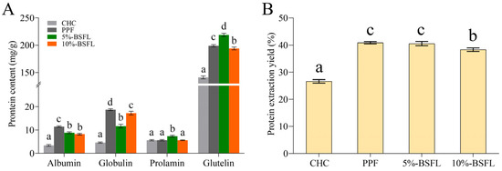 Concentration of protein fractions in A. domesticus reared on different feeds. Protein content (A), Protein extraction yield (B). CHC: commercial house cricket; PPF: house cricket fed with pure plant feed; 5% BSFL: the group fed substrate containing 5% BSFL powder; 10% BSFL: the group fed substrate containing 10% BSFL powder. Different letters within each column indicate significant differences (p < 0.05) between mean values, as determined by Duncan’s test.