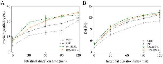 Protein digestibility (A) and hydrolysis degree (B) of protein in A. domesticus reared on different feeds during in vitro digestion. CHC: commercial house cricket; PPF: house cricket fed with pure plant feed; 5% BSFL: the group fed substrate containing 5% BSFL powder; 10% BSFL: the group fed substrate containing 10% BSFL powder.