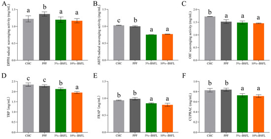 The antioxidant activity of proteins in different A. domesticus during in vitro digestion. DPPH radical scavenging activity (A), ABTS radical scavenging activity (B), hydroxide radical (OH-) scavenging activity (C), potassium hexacyanoferrate (III) total reducing power assay (TRP) (D), ferric reducing antioxidant power (FRAP) (E), cupric ion reducing activity (CUPRAC) (F). CHC: commercial house cricket; PPF: house cricket fed with pure plant feed; 5% BSFL: the group fed substrate containing 5% BSFL powder; 10% BSFL: the group fed substrate containing 10% BSFL powder. Different letters within each column indicate significant differences (p < 0.05) between mean values, as determined by Duncan’s test.