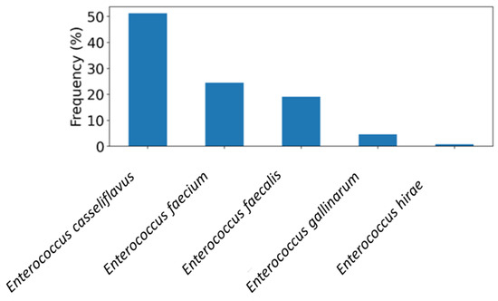 In the course of microbiological testing, 10 g of each sample was blended with 90 mL of Buffered Peptone Water (Oxoid, Basingstoke, UK) for two minutes (BagMixer® 400 P, Interscience, Saint Nom la Brétèche, France). This initial mixture was labeled 10−1, and a 10−2 dilution was subsequently prepared using 0.1% peptone water. From both dilutions (10−1 and 10−2), 100 µL was plated onto Slanetz–Bartley agar (Oxoid, UK) and incubated for 36–48 h at 41.5 °C [10]. Following incubation, as many as five colonies per plate that showed typical Enterococcus characteristics were chosen for species confirmation using the Autobio ms1000 MALDI-TOF system (Autobio Diagnostics, Zhengzhou, China). According to the manufacturer’s protocols, identification scores falling above 9.000 were regarded as reliable for species-level classification.