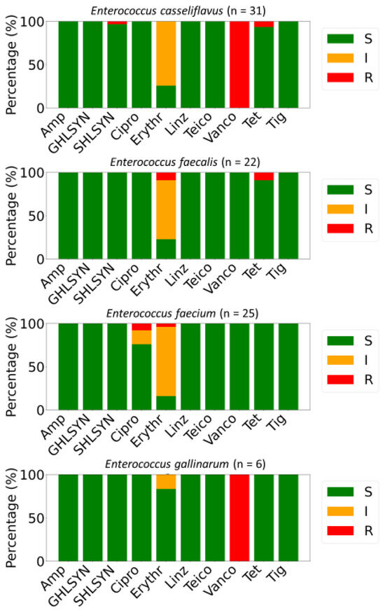Antimicrobial susceptibility testing of 85 Enterococcus isolates demonstrated variability in resistance patterns among species. Non-susceptibility to a minimum of one antibiotic was observed in 55.3% (n = 47) of the isolates, while 18.8% (n = 16) were classified as MDR (Figure 2). All isolates exhibited full susceptibility to ampicillin, high-level gentamicin (GHLSYN), linezolid (Linz), teicoplanin (Teico), and tigecycline (Tig). Intrinsic resistance toward vancomycin was detected in all E. gallinarum and E. casseliflavus isolates. High-level streptomycin (SHLSYN) resistance was identified in 1.18% of strains, exclusively among E. casseliflavus, while 98.82% remained susceptible. Resistance to ciprofloxacin was revealed in 2.35% of the characterized E. faecium strains, with 4.71% displaying intermediate resistance. Additionally, 3.53% of strains were resistant to erythromycin, whereas a substantial proportion (69.41%) exhibited intermediate susceptibility to this antibiotic (Figure 2).