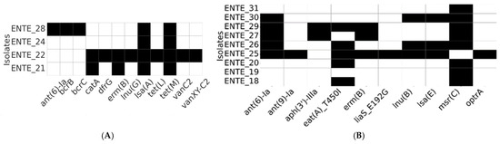 Resistome profiles of the whole-genome-sequenced E. faecalis (A) and E. faecium (B). The heatmap depicts the presence (black) or absence (white) of antimicrobial resistance determinants.