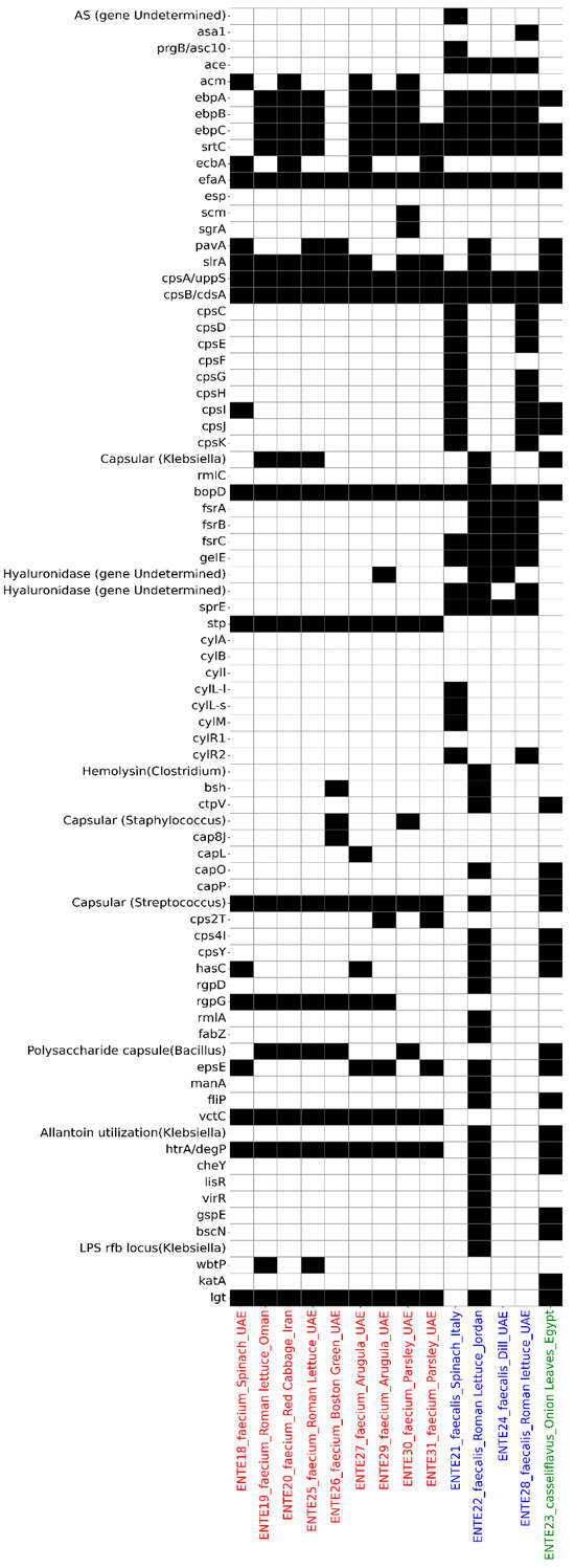 The putative virulome profile of the whole-genome-sequenced E. faecium (labeled red on the x-axis), E. faecalis (labeled blue on the x-axis), and E. casseliflavus (labeled green on the x-axis). The heatmap depicts the presence (black) or absence (white) of antimicrobial resistance determinants.