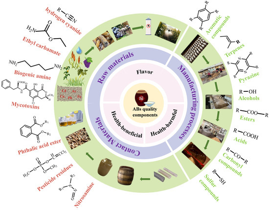 ABs act as a double-edged sword, as moderate drinking can be beneficial while excessive drinking can be harmful to health. This is because ABs contain some substances that harm health, such as residual agricultural pollutants, environmental pollutants, natural toxins, process-induced contaminants, food contact materials, illegal additives, and other harmful substances [31]. Pesticide contamination is a problem affecting many types of ABs. Grapes, the raw material used to make wine, are highly susceptible to pests and diseases, and the irrational use of pesticides can lead to pesticide residues or even surfeits in grapes. The maximum residue limit in the EU for carbendazim in wine is 0.5 mg/kg, and for methomyl, it is 1 mg/kg. Although the processing methods in the brewing process can significantly reduce the amount of pesticide residues, such as cold soaking, clarification filtration, and fermentation processes can significantly reduce the pesticide residue content in raw grape juice [32,33], several studies have shown that these residues are widely present in commercially available wine [34]. Acute toxicity may result if residues are high, and chronic toxicity may result from the long-term consumption of wine with low doses of pesticide residues. In addition to residues of exogenous substances, substances produced during the production of ABs may also increase the health hazards associated with their consumption; for example, ethyl carbamate is a carcinogenic substance widely found in ABs and fermented food. It has been classified as a Group 2A carcinogen by the International Agency for Research on Cancer (IARC). Its allowable limit in distilled spirits (e.g., tequila, whisky, and vodka) in the United States is 125 μg/L, and Canada has set its allowable limit in table wine in the range of 15 to 30 μg/L [35]. According to survey results, the detection rate of ethyl carbamate in wine is nearly 100% [36]. Biogenic amines are a class of amino-alkaline organic compounds widely found in fermented ABs such as wine, beer, and huangjiu. Excessive AB intake can cause symptoms of intoxication such as dizziness, nausea, respiratory disorders, and palpitations, and in severe cases, may lead to cerebral hemorrhage or even death [37]. In addition to the aforementioned substances, esters, aldehydes, higher alcohols, methanol, furfural, hydrogen cyanide, phthalate plasticizers, aflatoxins, hesperidin, and heavy metals are also important quality parameters affecting the safety of ABs [38].