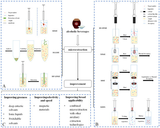 The quality of ABs is affected by intrinsic factors (e.g., flavor, functional value, and safety) [4], which are critically related to a complex combination of volatile and non-volatile components, including their interactions. A total of 130 odorants with an odor activity value (OAV) greater than 1, 139 functional substances, and 182 harmful substances found in baijiu, huangjiu, wine, and beer are summarized in Table S1. These substances are key to the quality of ABs; e.g., esters usually exhibit fruity and floral aromas, which contribute to the aromatic quality of ABs, and polyols in ABs have a certain sweetness, which can give roundness to the body of a beverage and add complexity to its mouthfeel. However, some substances can pose health risks and reduce AB safety to unacceptable levels. For example, the methanol present in ABs is a problem; it is toxic to humans, causing severe poisoning when a volume of 5–10 mL is ingested, blindness when more than 10 mL is ingested, and death when 30 mL is consumed [5]. As demonstrated by numerous studies, the types of raw materials, contact materials, and manufacturing processes can influence the formation and concentration of the substances mentioned above. For instance, Xu [6] et al. found that in fortified Daqu inoculated with Bacillus subtilis and Staphylococcus epidermidis, the abundance of Pantoea, Weissella, Staphylococcus, and Thermoascus was relatively high, leading to an increase in the contents of esters and aromatic compounds. Zhao [7] et al. studied the brewing characteristics of glutinous sorghum and non-glutinous sorghum and found that the contents of ethyl acetate, ethyl caproate, and ethyl butyrate in liquor brewed from non-glutinous sorghum were all higher than those in liquor brewed from glutinous sorghum. Through the analysis of the physicochemical properties and starch properties of sorghum, it was found that the total starch and tannin content of non-glutinous sorghum was the highest, which might be the direct cause of the high content of the above substances. Moreover, NTULI R G et al. [8] found that wines fermented at higher temperatures have a more prominent red color, and lower fermentation temperatures increase the concentration of esters. Therefore, only when we have deciphered the changes in the content of the relevant substances in each production process can we know the parameters that need to be controlled, and this requires a comprehensive analysis of the composition of ABs. ABs have a complex composition involving a wide variety of substances, some of which are present at extremely low levels and are easily altered; e.g., sulfur compounds are usually present in ABs at low levels and low thresholds, contributing to the odors of ABs, i.e., savory and oniony odors, making it challenging to comprehensively and accurately analyze their composition, which requires effective analytical methods. The analysis of ABs often encompasses both subjective and objective dimensions. The subjective analysis primarily involves consumers or professional evaluators who assess the aroma, taste, color, and other sensory attributes of ABs through their senses. Sensory analysis typically requires specialized training; however, sensory results are still susceptible to individual states and external environmental influences. Objective analysis, on the other hand, utilizes various instruments to analyze the components of ABs. Compared to subjective analysis, instrumental analysis is more accurate, reproducible, objective, and unaffected by fatigue or other similar factors [9]. Recently, AB quality analyses involved the widespread use of methods such as chromatography, spectroscopy, and separation techniques that can be combined with mass spectrometry (such as LC-MS and GC-MS) to enable the high-throughput and high-sensitivity analysis of components [10]. Moreover, testing technologies such as NMR and FT-IR can achieve rapid and non-destructive detection. However, neither of these techniques can effectively distinguish between complex matrices and detect low-concentration substances [11]. Therefore, pretreatment techniques are necessary to achieve reliable analysis. At present, several methods have been commonly used for AB pretreatment, such as direct injection (DI), liquid-liquid extraction (LLE), liquid-liquid microextraction (LLME), solid-phase extraction (SPE), solid-phase microextraction (SPME), stir bar sorptive extraction (SBSE), solvent-assisted flavor evaporation (SAFE), simultaneous distillation extraction (SDE), and purge and trap (P&T) [12]. Among the various extraction methods, traditional extraction technologies such as LLE and SPE can achieve the efficient detection of AB targets. However, these traditional methods also exhibit problems, such as high solvent and sample consumption and high labor requirements, and are time-consuming. Hence, there is a trend towards reducing organic solvent use for sample preparation or reducing sample use [13]. Furthermore, with the introduction of “green chemistry”, an increasing number of researchers have improved traditional methods and derived new extraction methods, such as microextraction; microwave-assisted, ultrasonic-assisted, and membrane-assisted extraction; and supercritical fluid extraction [14]. Among these, microextraction techniques are a particularly promising development, offering significant advantages in terms of reducing solvent usage, sample volume, and environmental impact.