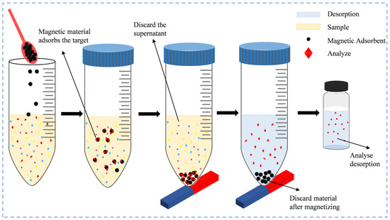In addition to improving the environmental friendliness of the extractants used, the development of new adsorbents has had a significant impact on the advancement of analytical methods such as dispersive solid-phase extraction (DSPE), resulting in new methods such as magnetic solid-phase extraction (MSPE) and magnetic solid-phase microextraction (MSPME). DSPE consists of dispersing the adsorbent in the sample matrix, using the adsorbent particles to enrich the analyte, and separating the target substance from the solid-phase material using solvent elution. When the amount of adsorption material is in the milligram range, it is called dispersive micro-solid-phase extraction (D-μSPE), and sometimes, it is also called dispersive solid-phase microextraction [167]. MSPE is a new D-μSPE technique developed by SAafarikova [168] et al. in 1999, which can be thought of as dispersive solid-phase microextraction using magnetic adsorbents (Figure 3). The introduction of magnetic materials simplifies the recovery of adsorbents in D-μSPE, which is often its most complex step. At present, a variety of magnetic materials have been thoroughly studied, and new magnetic nanomaterials can be prepared according to the properties of the target substance to be tested to improve the selectivity of MSPE.