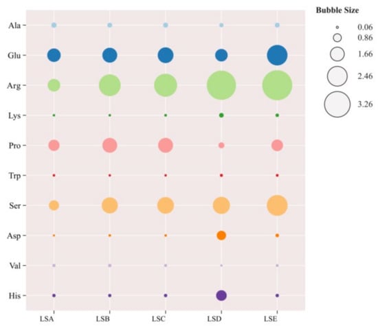 | Arginine | Bitter | 73.81 ± 0.35 c | 136.42 ± 1.84 b | 145.04 ± 5.01 b | 187.38 ± 6.99 a | 193.17 ± 1.16 a |
