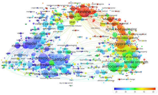 In recent years, escalating demands for food safety and quality management have positioned active packaging, intelligent packaging, and meat safety as critical research frontiers [27]. To systematically map interdisciplinary trends and technological convergence, this review employs a bibliometric analysis of keyword co-occurrence patterns, supported by VOS viewer-1.6.18 software. Figure 1 presents the keyword co-occurrence network, revealing two dominant clusters, active packaging and intelligent packaging, distinguished by their large node sizes (indicating high citation frequency) and dense interconnections (reflecting technological convergence). Notably, these clusters exhibit functional complementarity, suggesting synergistic potential in practical applications. A distinct sub cluster focusing on meat freshness assessment emerges, characterized by key terms such as TVB-N, detection methods, and sample analysis. This reflects the field’s reliance on chemical analytics and intelligent monitoring systems to evaluate meat quality. The color-coded cluster distribution further demonstrates interdisciplinary research diversity, with mechanical properties, thermal stability, and antimicrobial activity forming a cohesive research axis. This underscores a dual paradigm: optimizing functional packaging performance while advancing novel material development for food packaging applications. The analysis identifies three persistent research trajectories: (1) the integration of active and intelligent packaging systems for enhanced synergy; (2) advanced intelligent systems enabling real-time monitoring; and (3) innovative freshness assessment methodologies to improve accuracy [28].