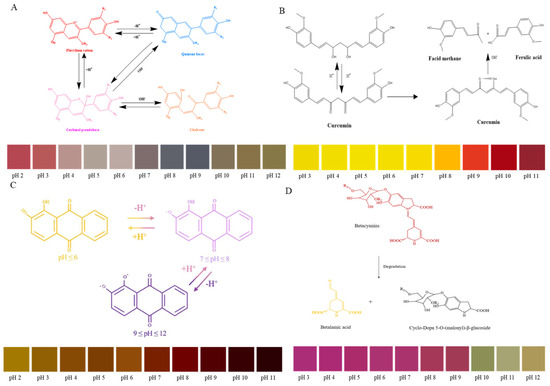 Structure transformation and color changes in natural pigments ((A): anthocyanin; (B): curcumin; (C): alizarin; (D): betaine).