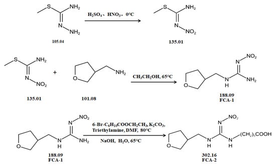 Two haptens, termed FCA-1 and FCA-2, were synthesized (Figure 1) according to reported studies with some modifications [28,29]. The two haptens were then coupled to carrier proteins by glutaraldehyde and active ester methods, respectively, to prepare artificial antigens. Solution A was made by mixing 0.12 mmol OVA and 0.02 mmol glutaraldehyde in a CBS buffer (0.01 M, pH 9.6) and was stirred at 4 °C for 30 min. Solution B was made by dissolving 0.02 mmol FCA-1 in 300 μL DMF. Then, solution B was slowly dropped into solution A, and the mixed solution was stirred at 4 °C for 8 h; it was then terminated by adding sodium borohydride to obtain solution C.