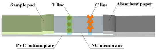The strip consists of a PVC bottom plate, sample pad, NC membrane, and absorbent paper. The initial treatment solution for the sample pad used a PB (0.2 M) containing 0.3% (w/v) PVP and 0.5% (v/v) Tween-20. The T line and C line of the NC membrane were coated with FCA-1-OVA and a goat anti-mouse IgG antibody, respectively. The processed sample pad and NC membrane were dried at 50 °C and 37 °C for 12 h and then assembled, as shown in Figure 2. The cut strips were sealed at room temperature under dry conditions.