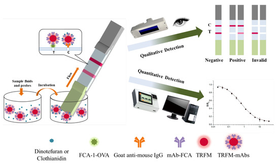 According to Table 1, the most common immunoassay method for the detection of dinotefuran or clothianidin is ELISA, but it has the disadvantages of being time-consuming and cumbersome. Both ICA and FPIA have low sensitivity. TRFIA utilizes lanthanide chelates as markers, and its sensitivity still has the potential for enhancement. However, the time-resolved fluorescent microspheres lateral flow immunoassay (TRFMs-LFIA) is faster and simpler. TRFMs-LFIA is an immunoassay that combines fluorescence and chromatography, utilizing time-resolved fluorescent microspheres as markers that bind multiple lanthanide chelates on microspheres [23], making it more sensitive than TRFIA. Compared to traditional fluorescent materials, lanthanides offer several advantages, including long fluorescence lifetimes, a large Stokes shift between excitation and emission wavelengths, and a broad excitation spectrum coupled with a narrow emission spectrum. These properties make TRFMs-LFIA less susceptible to interference from background fluorescence and scattered light, resulting in enhanced stability and sensitivity. TRFMs-LFIA is faster compared to ELISA and more sensitive than TRFIA. Therefore, TRFMs-LFIA has been widely used in clinical testing, in vitro diagnostics, agriculture, veterinary drug residue detection, drug screening, environmental monitoring, and various other fields.