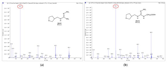 Mass spectrum plot of haptens: (a) FCA-1; (b) FCA-2.