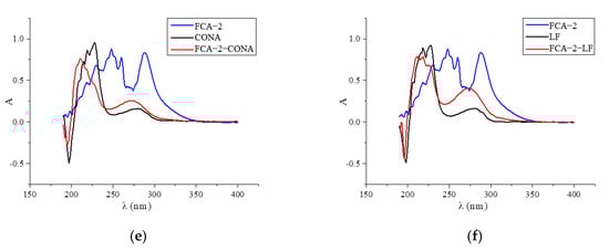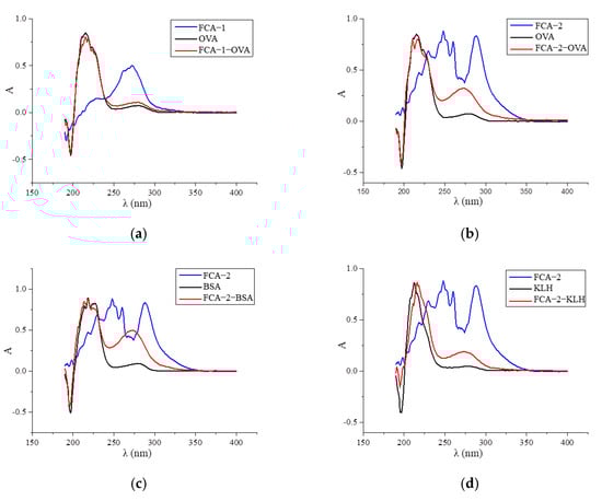 UV scan spectrum of artificial antigens: (a) FCA-1-OVA; (b) FCA-2-OVA; (c) FCA-2-BSA; (d) FCA-2-KLH; (e) FCA-2-CONA; and (f) FCA-2-LF.
