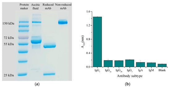 Characterization of antibody: (a) SDS-PAGE electropherogram; (b) antibody subtype.