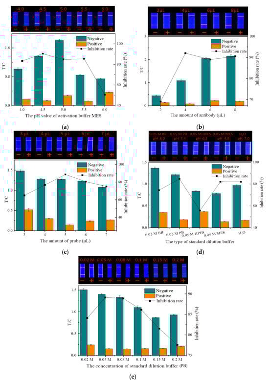 The pH of the microsphere activation buffer (MES) will affect the degree of microsphere activation by affecting the dispersion in the solution [33]. As shown in Figure 8a, when the pH was 4.0, the large aggregation of fluorescent microspheres made activation insufficient, which greatly affected the coupling rate with mAbs, making the fluorescence intensity of both the T and C lines very weak. With the increase in pH, both the fluorescence intensity and inhibition rate showed a trend of first increasing and then decreasing. At the pH value of 4.5, the fluorescence intensity and inhibition effect were optimal, so 4.5 was selected as the best pH for MES.