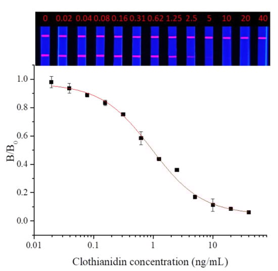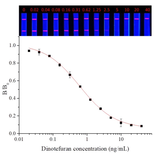 The standards of dinotefuran and clothianidin were gradient-diluted and tested under optimal conditions. B and B0 represent fluorescence intensity ratios of T to C with and without a standard, respectively. The standard curve was fitted by origin 9.0 using the standard concentration as the x-axis and values of B/B0 as the y-axis to obtain the limit of detection (LOD), 50% inhibitory concentration (IC50), and linear range (IC20~IC80). The sensitivity of TRFMs-LFIA was evaluated using these parameters.
