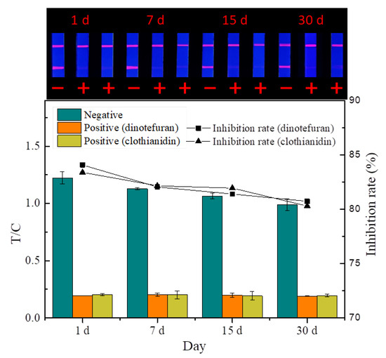The standard of dinotefuran (8 ng/mL) was detected by strips kept at room temperature under dry conditions on days 1, 7, 15, and 30 d, respectively, and the inhibition rates and fluorescence intensity were compared to evaluate the stability of TRFMs-LFIA.