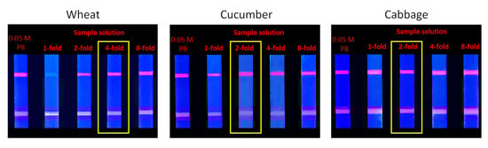 Blank wheat, cucumber, and cabbage samples were detected by HPLC-MS/MS and were identified to be dinotefuran- and clothianidin-free. The matrix effect was eliminated through pretreatment and gradient dilution. The pretreatment method was improved according to the literature [17]. In total, 10 g (±0.01 g) homogenized samples was mixed with a 20 mL PB (0.05 M) containing 10% (v/v) ethanol in a centrifuge tube. Each tube was shaken for 15 min, and the extract was filtered. The filtrate was diluted in PB (0.05 M) to 1-, 2-, 4-, and 8-fold and tested by TRFMs-LFIA to determine the optimal dilution of the fluorescence intensity close to the PB.