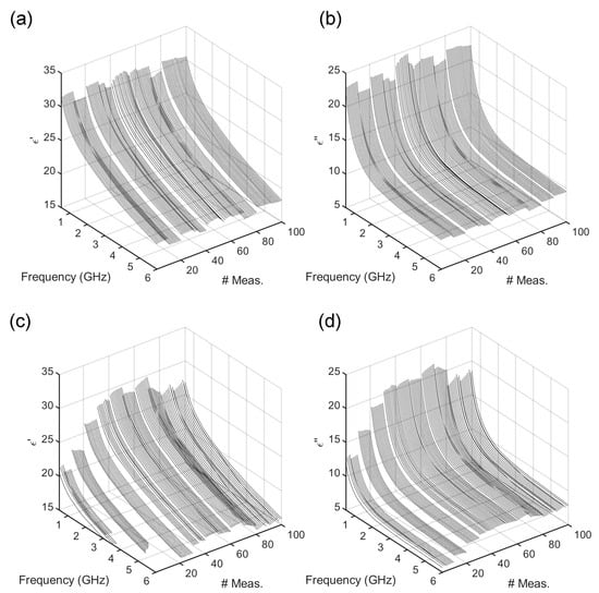 Dielectric permittivity data versus frequency (GHz) and no. of measurements before dough leavening ( min) in terms of the (a) real part (), (b) imaginary part (), and after leavening ( min), in terms of (c) real part (), (d) imaginary part ().
