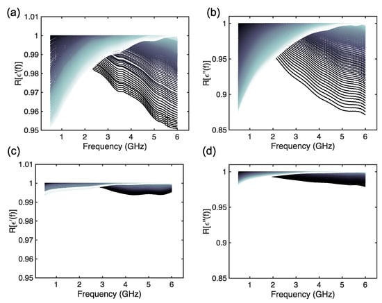 Pearson’s correlation coefficient () for the dielectric permittivity of Carasau bread dough data versus frequency (GHz), before dough leavening ( min) for the (a) real part () and (b) imaginary part (), and after leavening ( min) for the (c) real part () and (d) imaginary part ().