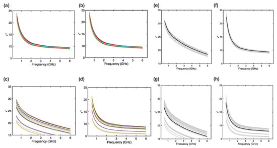 MW DS spectra before leavening ( min): (a) real part of the permittivity () and (b) imaginary part of the permittivity () with the ten means for each sample overimpressed. MW DS spectra after leavening ( min): (c) real part of the permittivity () and (d) imaginary part of the permittivity () with the ten means for each sample overimpressed. MW DS spectra before leavening ( min): (e) real part of the permittivity () and (f) imaginary part of the permittivity () with the mean calculated from all measurements. MW DS spectra after leavening ( min): (g) real part of the permittivity () and (h) imaginary part of the permittivity () with the mean calculated from all measurements.