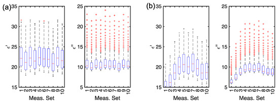 To this aim, the boxplots of the real and imaginary parts of the permittivity, before and after leavening, are given in Figure 4. The boxplots are computed for all frequencies . From Figure 4 it can be noted that the means are not far across the measurement sets before leavening and that the standard deviations are very similar. For the imaginary part of the permittivity, outliers have been identified, but they are uniformly distributed.
