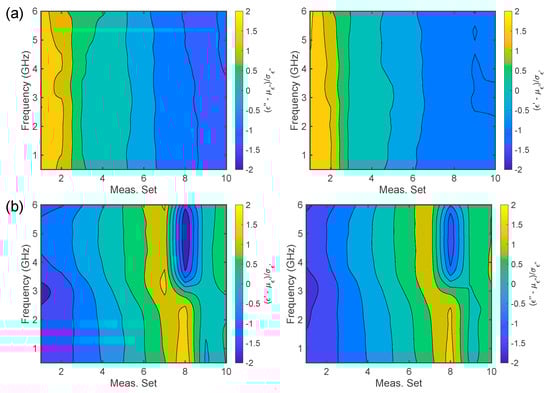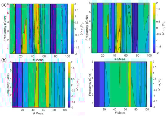 In Figure 6, the z-score contour plot over frequency and the number of measurements is presented. With respect to Figure 5, it is worth specifying that the mean and standard deviation are computed over the whole 100-measurement set. In Figure 6a it is possible to observe that, at min, the complex permittivity reaches values below the mean for measurements 10–20, 30–40, and 70–80, whilst it is higher for measurements 40–50. On the other hand, after leavening, this situation drastically changes, and dips in the z-score are observed for measurements 1–20, whilst the occurrence of permittivity values higher than the mean are less frequent. By comparing the z-score from Figure 6 with that from Figure 5, it can be noticed that the deviations from the mean are uniform with respect to frequency.