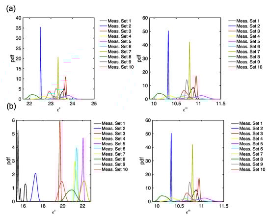 KDE for the complex dielectric permittivity Carasau bread dough data for the 10 measurement sets, for GHz, (a) before dough leavening ( min) and (b) after leavening ( min).