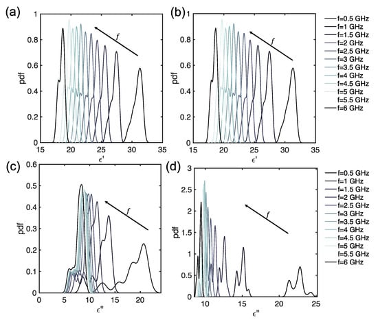 In Figure 9 the probability density functions KDE for the 100 measurements and for various frequencies are reported. It can be noticed that, considering a given frequency value, pronounced peaks can be observed for and , before leavening (Figure 9a,b). However, as frequency increases, a shoulder appears in the KDE. After the leavening, the KDE presents more complicated behavior, since several peaks and shoulders are evident at any frequency for and , thus showing the larger variability of the MW DS measurements.
