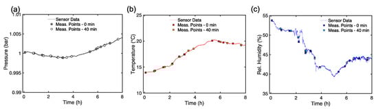 (a) Room pressure (in bar) over measurement time (in h). (b) Room temperature (in °C) over time. (c) Relative humidity (in %) over time.