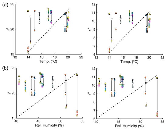 Scatter plots of the (a) real part ( left) and imaginary part (, right) of the permittivity versus room temperature (in °C). (b) Real part ( left) and imaginary part (, right) of the permittivity versus relative humidity (in %). Circles represent dielectric data at min and squares represent dielectric data at min. The 10 different colormaps represent the measurement batches. The black dashed line represents the smoothing function.