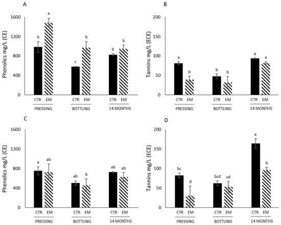 Phenolic and tannin concentrations in control and EM wines made from Marquette and Petite Pearl cultivars. (A) refers to phenolics concentration in wines made with Marquette cultivar; (B) refers to tannin concentration in wines made with Marquette cultivar; (C) refers to phenolics concentration in wines made with Petite Pearl; (D) refers to tannin concentration in wines made with Petite Pearl cultivar. Different letters indicate statistically significant differences (p < 0.05) by two-way ANOVA (time point versus treatment) followed by Tukey’s test.