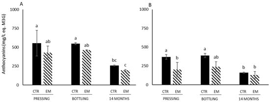 EM did not have a statistically significant effect on hue, color intensity, or L* a* b* values in wines made from Marquette (Table 3). However, hue significantly increased from pressing to 14 months of aging for both the control and EM wines, and color intensity significantly decreased over the same period. No statistically significant difference was observed in L* values between these time points (Table 3). EM only had a statistically significant effect on the hue at bottling, on the color intensity at pressing, on a* at pressing, and on b* both at pressing and after 14 months of storage in wines made from Petite Pearl (Table 3). In Petite Pearl wines, the concentration of anthocyanins (Figure 2) was lower than in Marquette wines, which could explain the marked changes in color parameters. At the same time, hue was statistically increasing for both control and EM wines between pressing and 14 months of storage, and color intensity was decreasing only for control wines for the same period (Table 3).