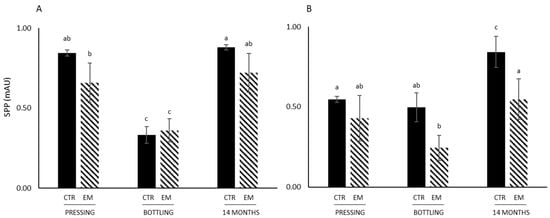 Small Polymeric Pigments (SPPs) in EM wines. (A) refers to wines made with Marquette cultivar, and (B) refers to wines made with Petite Pearl cultivar. Different letters indicate statistically significant differences (p < 0.05) by two-way ANOVA (time point versus treatment) followed by Tukey’s test.