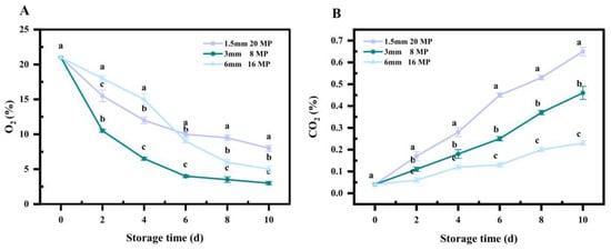 O2 (A) and CO2 (B) levels in leaf-vegetable sweet potatoes treated with 1.5 mm, 20 MP; 3 mm, 8 MP; and 6 mm, 16 MP after 10 days of storage at 10 °C and 90% RH. Data are presented as means ± standard errors, based on three replicates. Vertical bars represent standard errors of means. Statistically significant differences (p < 0.05) are indicated by different lowercase letters.