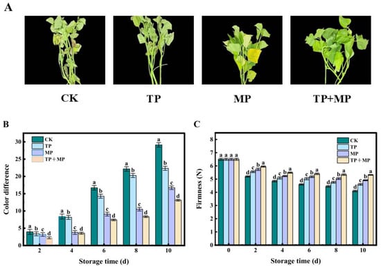 The visual appearance (A), color difference (B), and firmness (C) of leaf-vegetable sweet potatoes treated with TP, MP, and TP + MP were compared with the control group after 10 days of storage at 10 °C and 90% RH. The data are expressed as means ± standard errors, based on three replicates. The vertical bars indicate the standard errors of the means. Statistically significant differences (p < 0.05) are denoted by different lowercase letters.