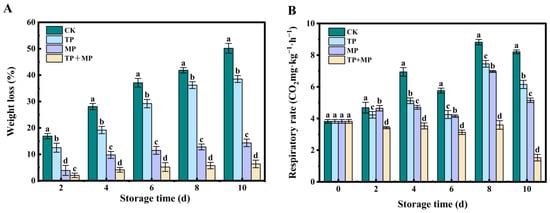 The weight loss (A) and respiration rates (B) of leaf-vegetable sweet potatoes treated with TP, MP, and TP + MP were compared with the control group after 10 days of storage at 10 °C and 90% RH. The data are expressed as means ± standard errors, based on three replicates. The vertical bars indicate the standard errors of the means. Statistically significant differences (p < 0.05) are denoted by different lowercase letters.