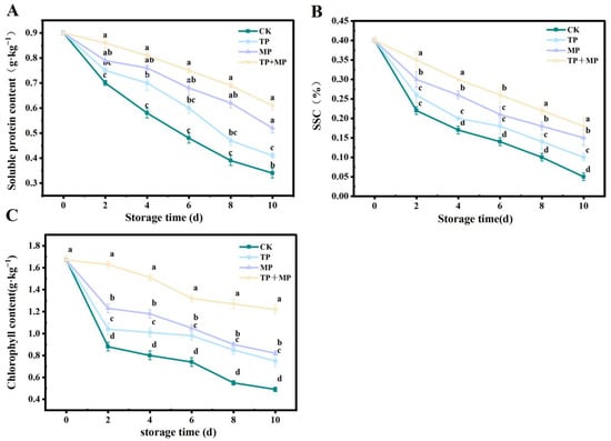 As illustrated in Figure 4A, the soluble protein content in all treatment groups declined over the storage period. Significant differences (p < 0.05) were observed between the treatments. Notably, after 10 days of storage, the TP + MP group maintained the highest soluble protein content, whereas the CK group exhibited the lowest levels.